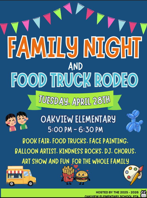 - Join your Oakview friends at CarnivOWL on Friday, April 26th from 6-8:30 here at school.